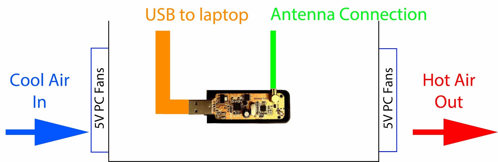Place stick into metal can, with antenna and USB cable connected and led through lid of can, position stick middle of can, slightly above bottom.